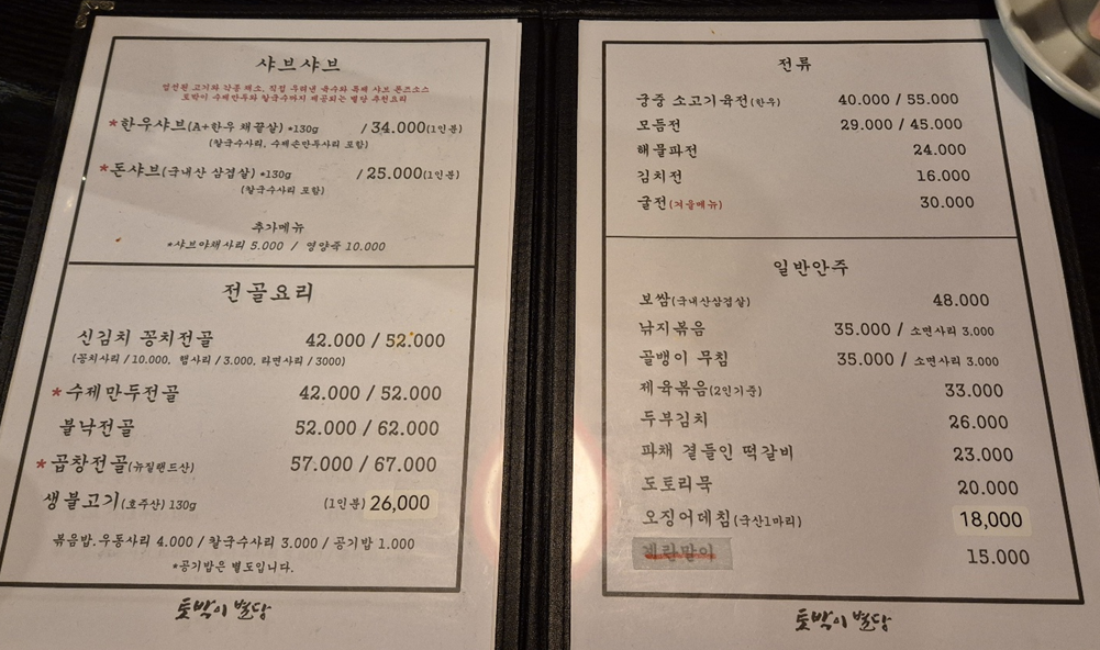 만두전골, 불낙전골, 곱창전골 등등